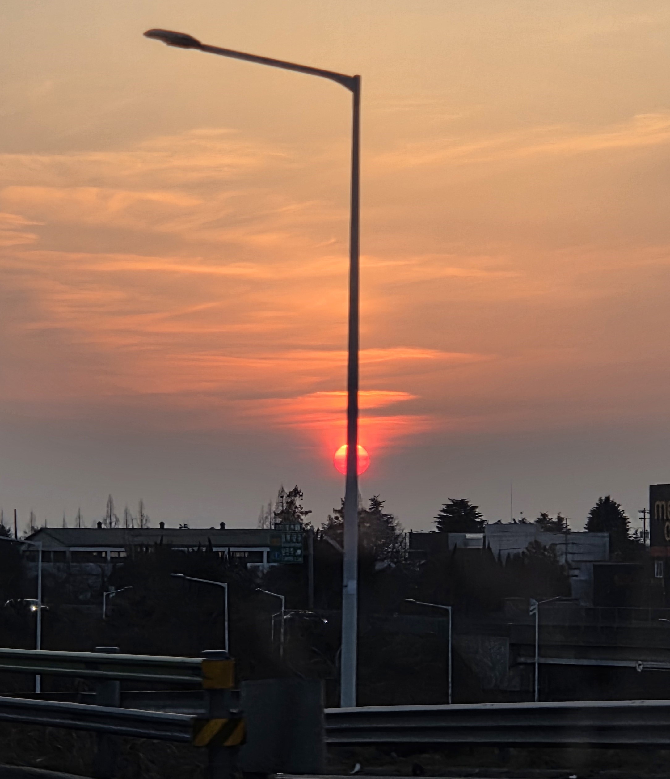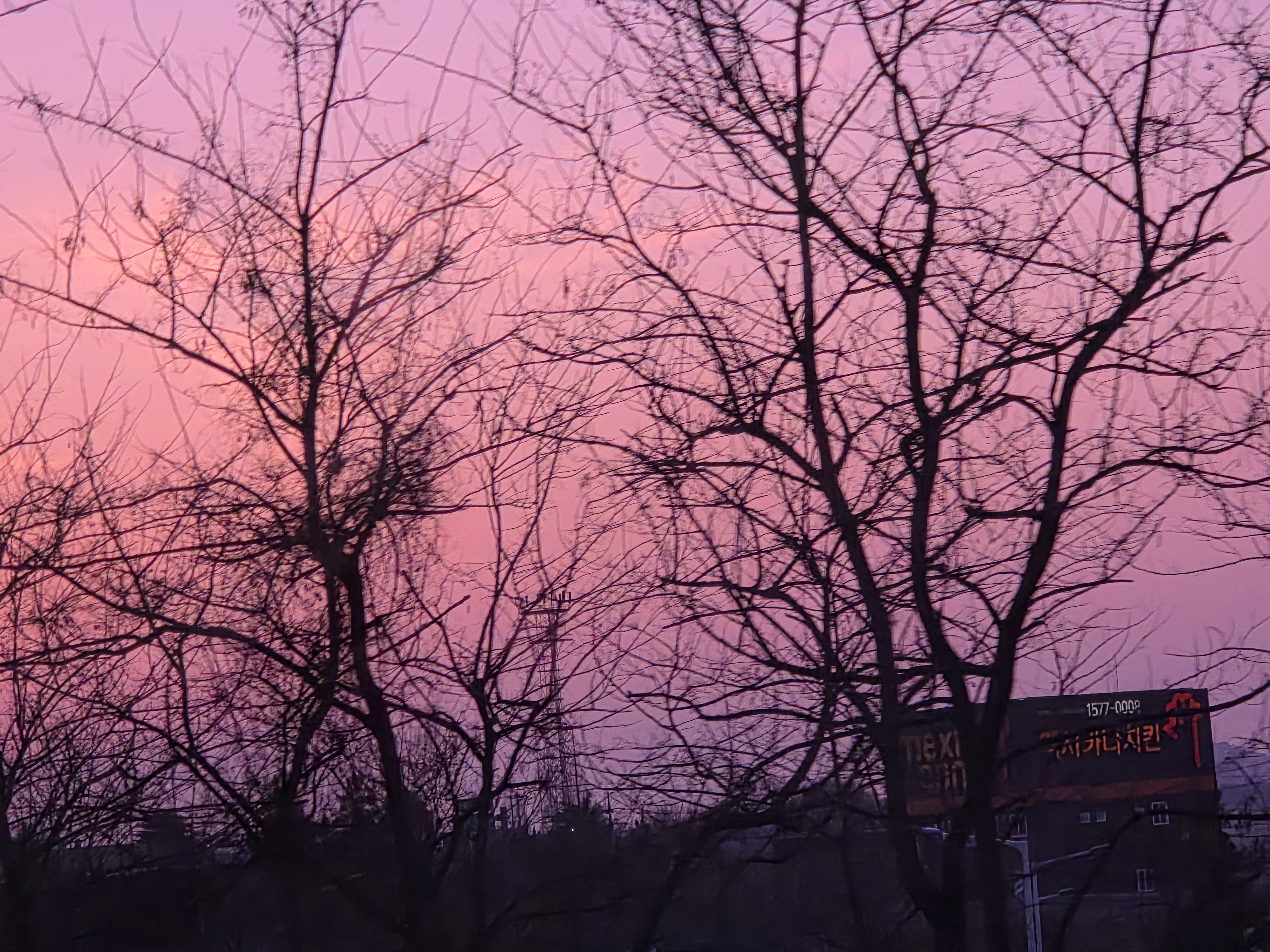 톨게이트 위에 떠 있는 달과 가로등 / 가로등과 석양의 조화 / 분홍과 보랏빛 바탕에 그려진 나뭇가지의 실루엣까지