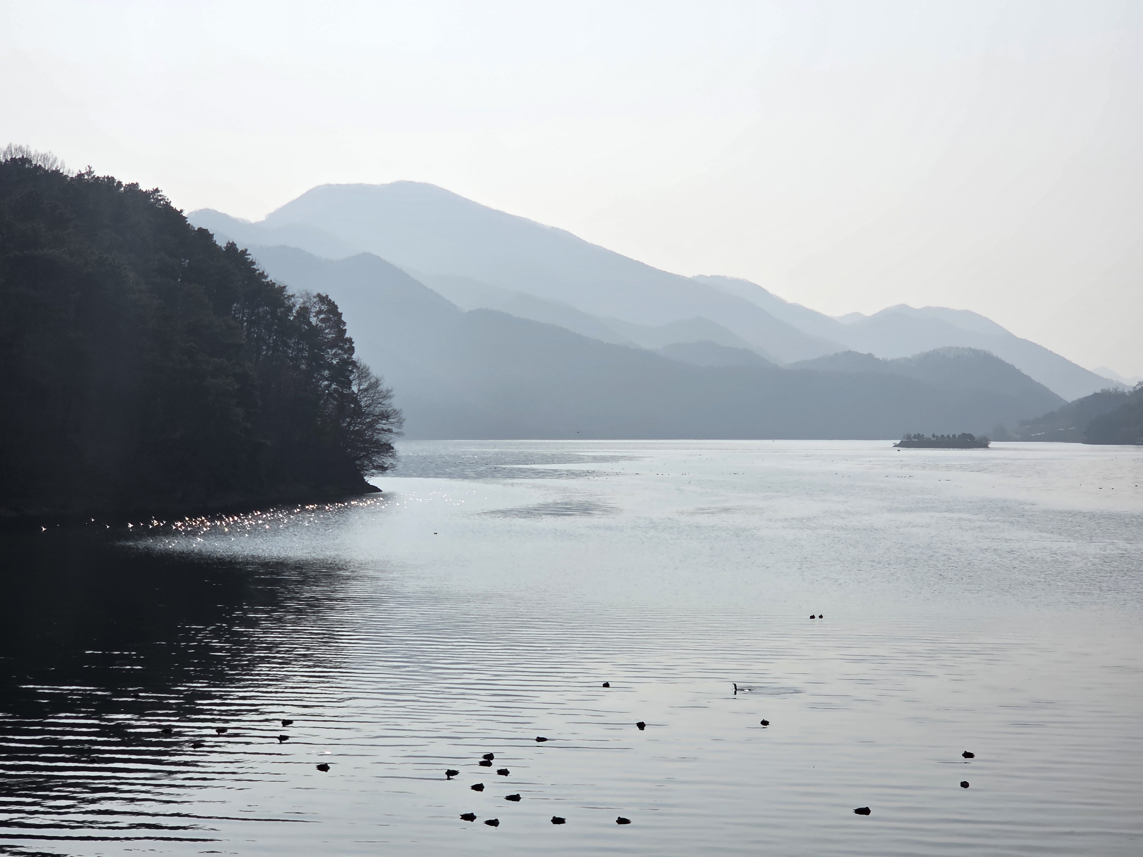 겹겹의 산이 만들어낸 자연 글라데이션, 그것을 즐기기라도 하듯이 한가롭게 노니는 새들의 모습이 참 평화롭게 보였다. 한편으로는 춥지 않을까 하는 현실적인 생각도 들었다.