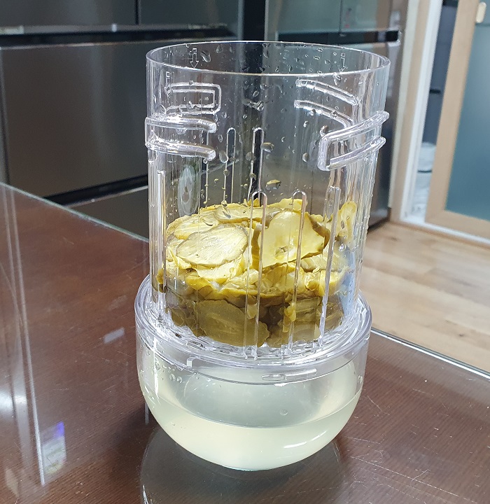 기대 반, 궁금함, 반으로 오이지를 꺼내 썰어서 물에 10분 정도 담가두고 바로 써봤어요.