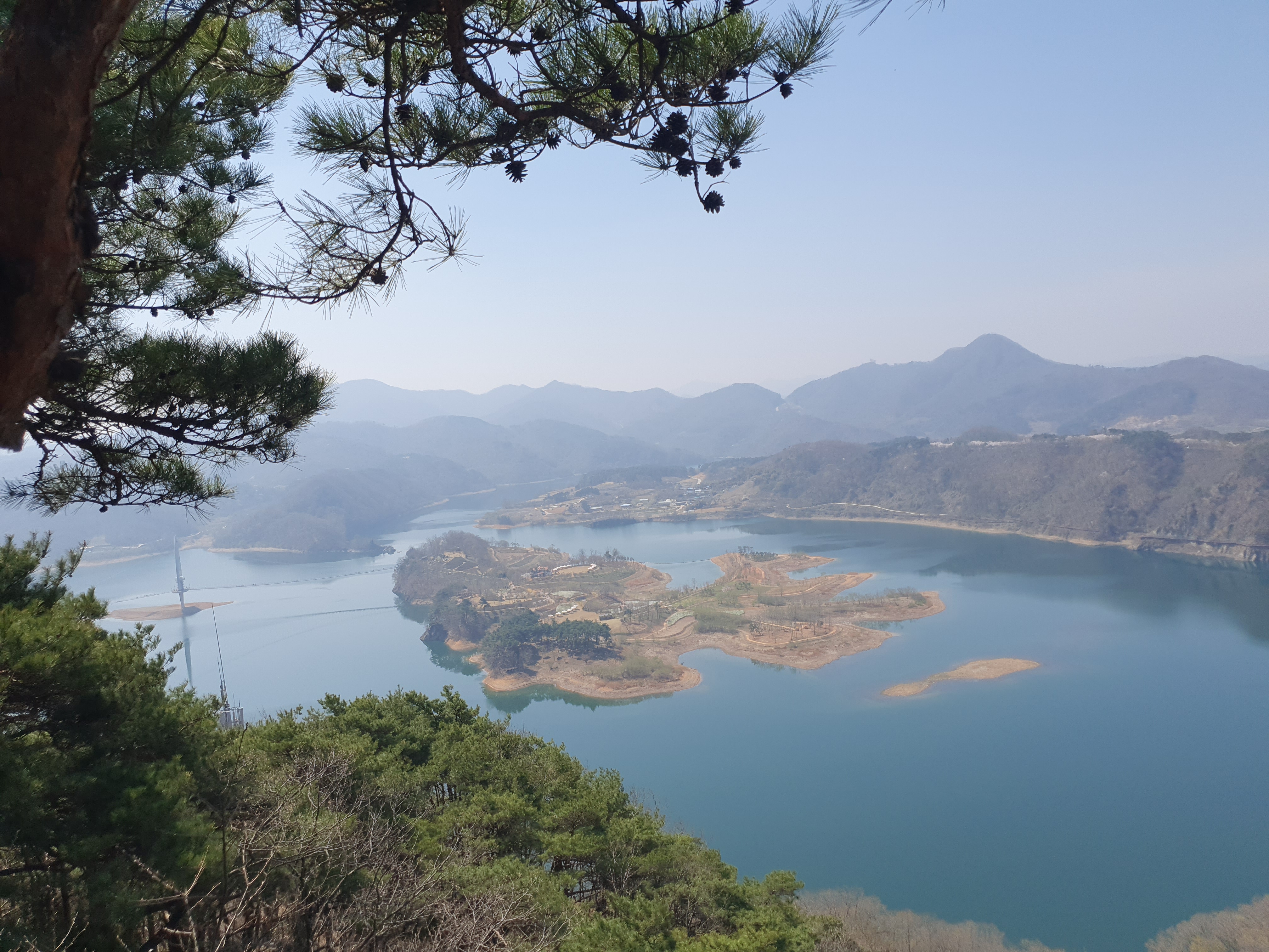 중턱에서 내려다본 붕어섬은 마치 커다란 붕어 한 마리가 호수 위에 떠 있는 듯한 모습이었고, 정상에 올라서 보는 붕어는 몸은 숨기고 꼬리만 남기고 있는 모습을 볼 수가 있습니다.