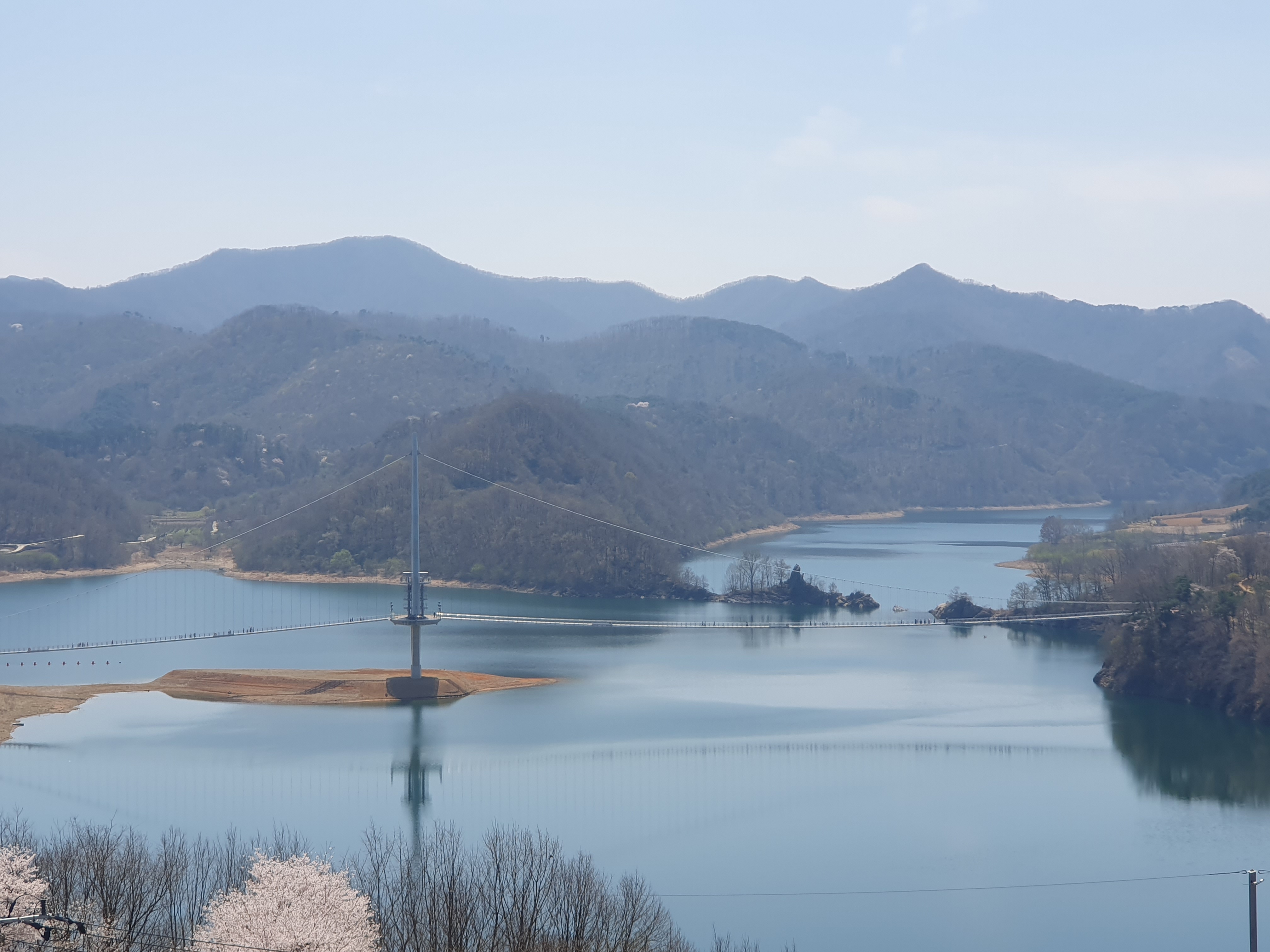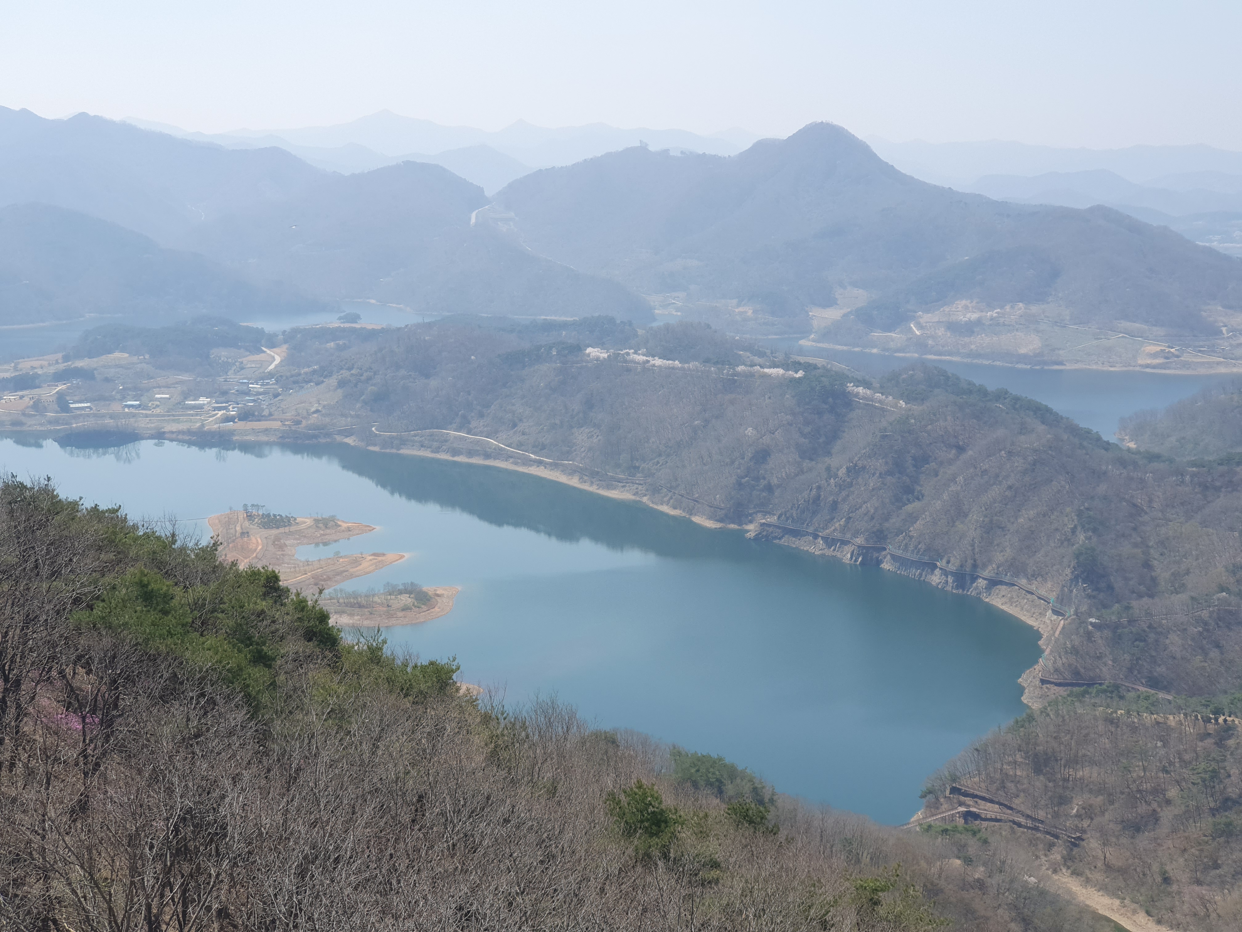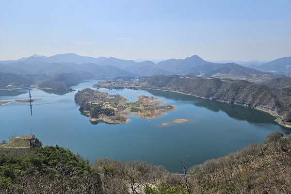 그렇다고 단순히 벚꽃길을 가로질러 출렁다리와 붕어섬만 들렸다가 가신다면 이곳의 진짜 매력을 놓치고 가시는 거랍니다. 진정한 국사봉 여행은 산을 올라 포토존에서 붕어섬을 내려다보며 자연이 선사하는 절경을 감상하는 것부터 시작됩니다. 마치 한 폭의 그림을 넘어 여러 폭의 병풍이 펼쳐진 듯한 그 풍경은, 직접 보지 않고는 설명이 어려울 정도로 아름답습니다.