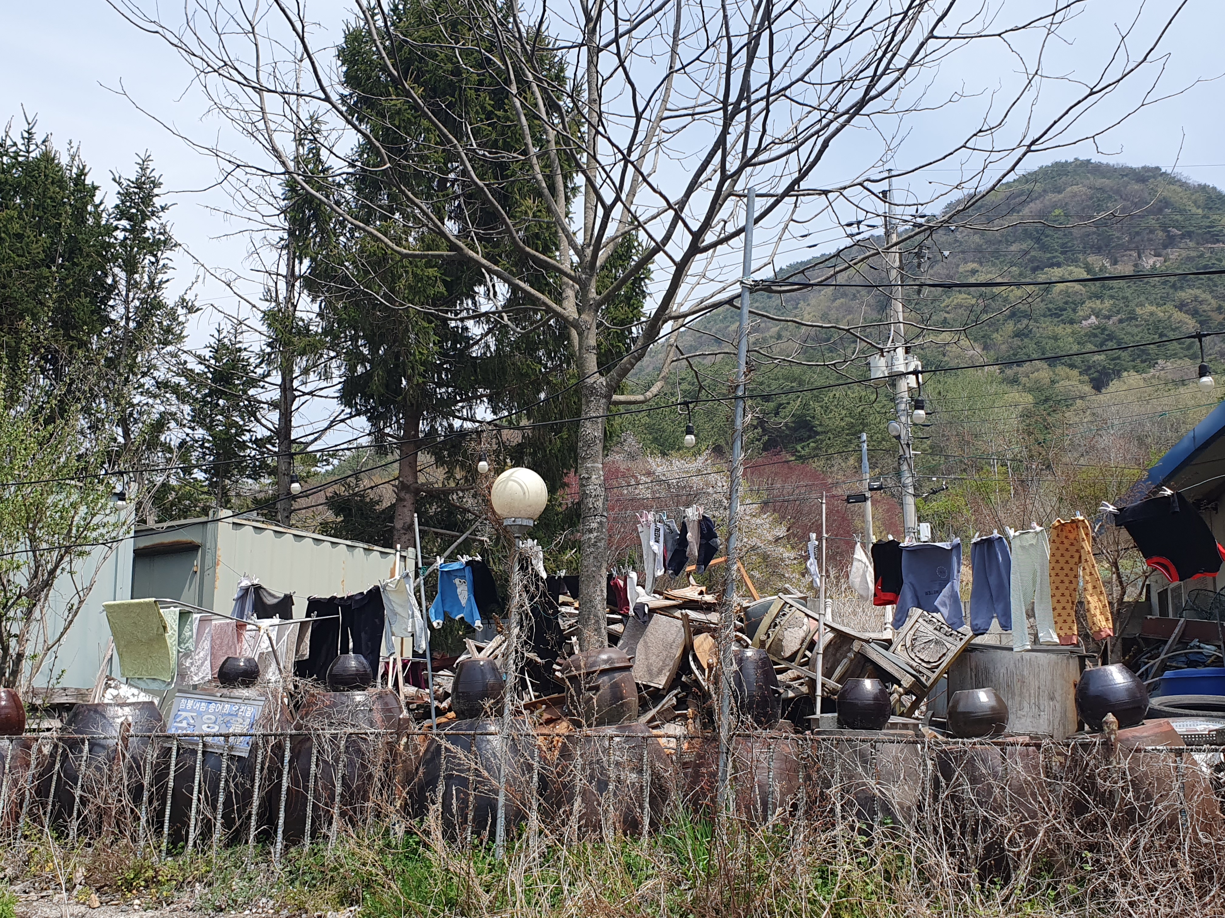 휀스 안 작은 시골집 마당에는 요즘 보기 드문 빨랫줄이 있었고, 그 위에서는 옷들이 바람따라 시원하게 춤을 추고 있었다. 옆으로는 장독을 쌓아 놓은 담장이 시골스러운 정취를 더하며, 지나가는 이의 눈길을 사로잡았다.