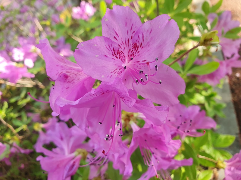 걷다 보니 학교 돌담 사이에 피어난 철쭉이 유독 인상 깊게 다가왔습니다. 분홍빛 철쭉이 거칠고 투박한 돌틈 사이 군데군데 피어 있는 모습은 마치 자연이 정성껏 그려낸 한 폭의 커다란 벽화를 보는 듯했습니다. 인위적인 장식 없이도 이렇게 아름다울 수 있다는 사실에 새삼 자연의 섬세함과 조화로움이 느껴졌습니다.