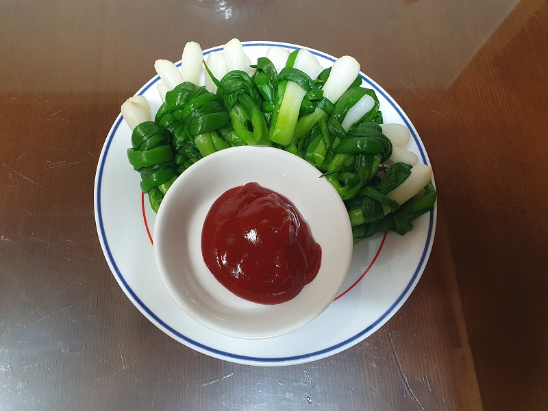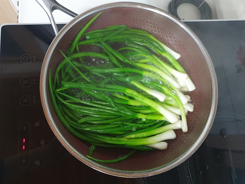 끓는 물에 소금을 약간 넣고 두툼한 쪽파의 흰 부분을 먼저 살짝 데친 뒤 잎 부분도 마저 넣어 숨이 죽을 정도로만 데쳐 냈습니다. 데친 쪽파를 찬물에 헹군 다음 물기를 꼭 짜서 먹기 좋게 말아 놓습니다. 그런 후 이번에는 쪽파를 찍어먹을 초고추장을 만들기 위해서 고추장,식초,설탕 1:1:1로 넣고 잘 섞으면 맛있는 초고추장이 만들어 집니다. 데쳐서 만들어 놓은 쪽파를 찍어 먹으면 맛있겠죠? 이렇게 또 하나의 반찬 쪽파숙회를 완성했 놓았습니다.
