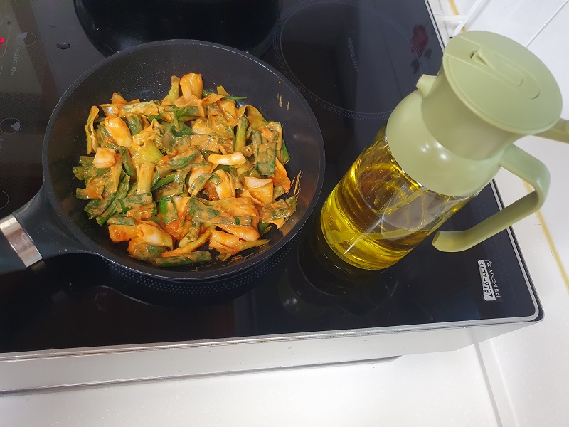 식혀 둔 밀가루 풀에 갈아 놓은 양념을 넣고 고춧가루까지 넣어 잘 섞어준 다음 간을 보니 살짝 덜 단 느낌이라 원당을 살짝 추가했답니다. 고춧가루가 불도록 잠시 두고, 쪽파의 양이 많아 그 사이 반찬 하나를 더 만들어 보았습니다.