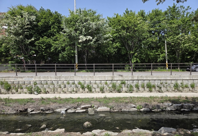 철길 너머로는 긴 개울이 흐르고 있었고, 어떤 구간은 분수처럼 단장되어 있었다.