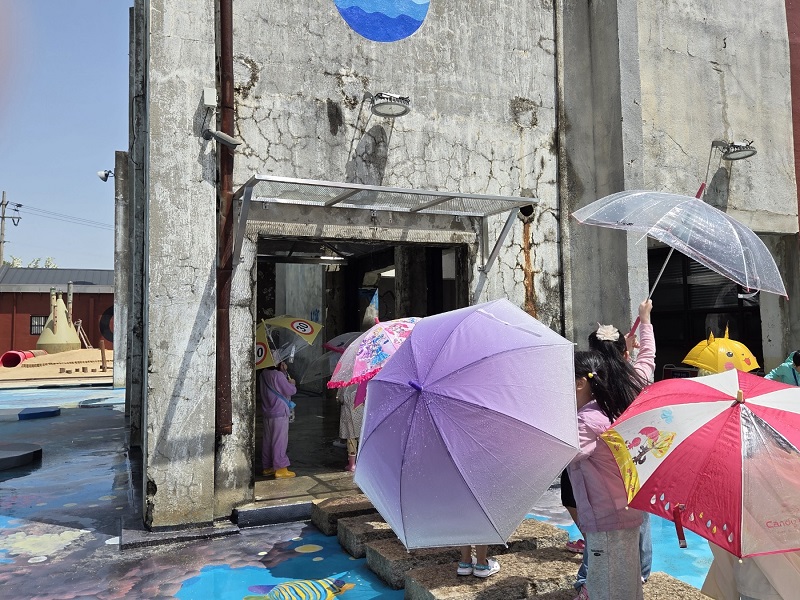 다시 걸음을 옮기다 보니 낡아 천장에서는 물이 뚝뚝 떨어지고 음침해 보이기까지 하는 건물이 보였다. 그런데 외부 바닥은 대조적으로 푸른 물과 물고기 그림이 그려져 있는 모습이었다. ‘뭘까?’ 하는 궁금함과 동시에 우산을 든 아이들이 몰려와 우비와 우산을 펴고 천정에서 떨어지는 물을 맞으며 즐겁게 뛰놀고 있었다. 음침해 보이던 그 공간이 아이들에게는 신나는 놀이터였다.