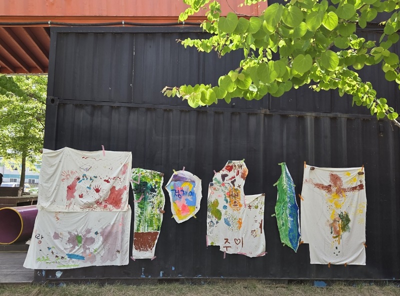 지저분한 천에 귀찮아 대충 물감을 입혀 놓은 것 같았다. “이게 작품이라고?” 의아해 했다. 2층에 마련된 어린이 체험 공간에서 그 정체를 알게 되었다. 바로 아이들이 직접 그린 그림들이었다. 알고 나니 다시 보이기 시작했다. 아이들의 상상과 감성이 담긴 진짜 예술이었던 것이다.