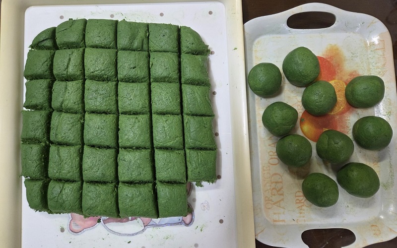 먼저 큰 덩어리 반죽을 넓적하게 만든 다음 칼을 이용하여 한 번 먹을 적당한 크기로 자른 뒤 동그랗게 만들어 놓는다. 그런 다음 동그란 반죽을 하나씩 랩으로 싼 접시 위에 올려놓은 후 밥그릇 아랫부분으로 살짝 눌러 주면 적당한 크기의 둥글고 예쁜 모양의 쑥개떡이 완성된다.