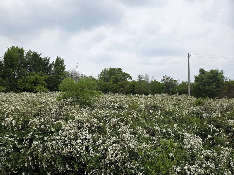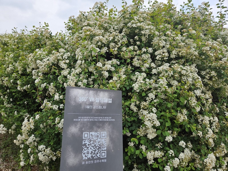 주차장으로 가는 길, 들어올 때는 미처 보지 못했던 공조팝 꽃동산이 눈에 들어와 발길이 자연스럽게 그쪽으로 옮겨졌다. 공조팝 꽃동산 가운데에는 전망대가 마련되어 있어 그곳에 올라가니 꽃으로 펼쳐진 작은 세상이 한눈에 들어왔다.