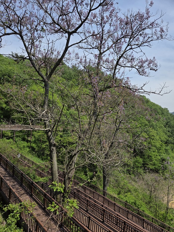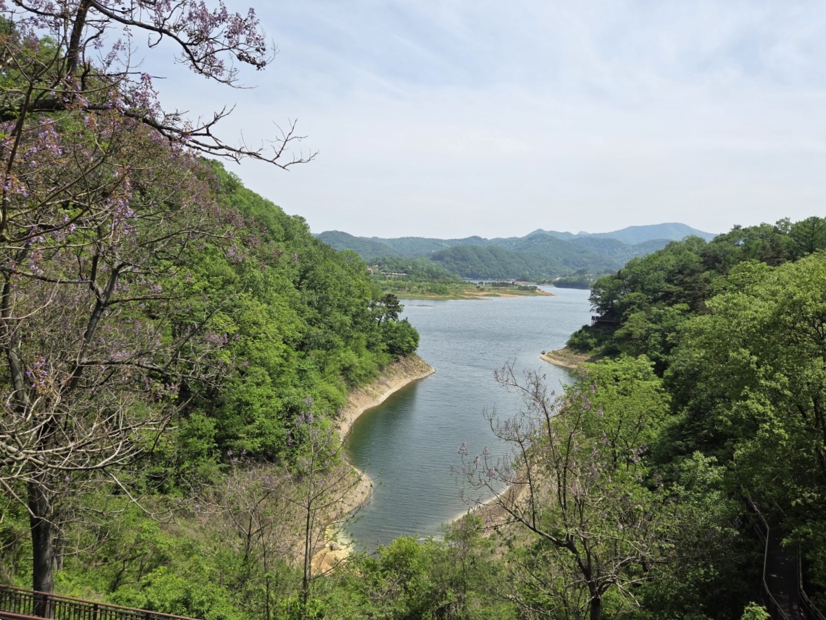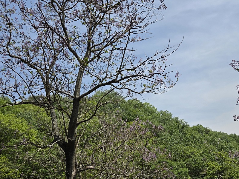 둘레길에 들어선 우리를 반겨준 건 커다란 오동나무 몇 그루였습니다. 장롱을 만들고도 남을 정도로 웅장한 나무에 작은 보랏빛 꽃이 은은하게 물들어 있었고, 그 너머로는 맑은 물과 붕어섬 일부가 마치 한 폭의 그림 같았습니다.