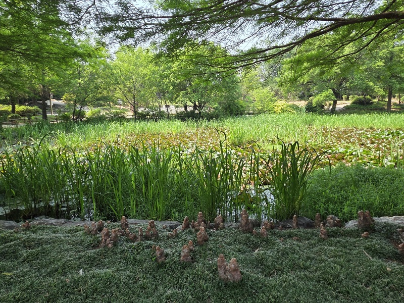 다양한 종류의 장미가 풍기는 향과 분위기가 달라서 지루할 틈이 없었다. 한참을 걷다가 지난번에는 보았지만 소개할 것이 많아 미처 소개해 드리지 못했던 나무뿌리가 시선을 사로잡았다. 땅 위로 솟아오른 뿌리들은 마치 조각품처럼 기묘한 형태를 이루고 있었고, 가까이 다가가 보니 낙우송과 공기뿌리라고 적혀 있었다. 나무가 땅속 공기가 부족한 곳에서 뿌리를 바깥으로 내보내어 숨을 쉰다는 사실이 신기했고 그 기이한 생김새에 여러 장의 사진을 남겼다. 이 뿌리는 호수를 배경으로 한 정자 근처에서 사진을 찍기 위해 줄을 서 있던 중에 우연히 발견한 것이었다. 자연은 늘 예상치 못한 모습으로 우리를 놀라게 한다는 걸 다시금 느꼈다.