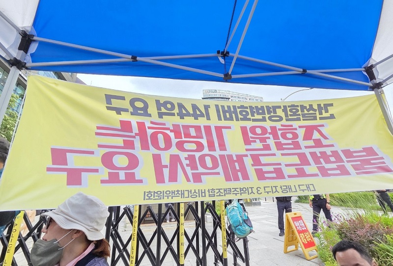 우리가 먼저 도착했을 때는 경찰차 세 대가 와 있었고, 본사 앞에는 바리케이드 설치되어 있었다. 그 주위를 경찰복과 사복을 입은 경찰들이 우리들을 주시하고 있었다.