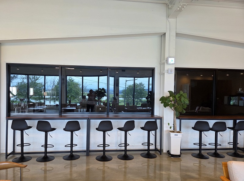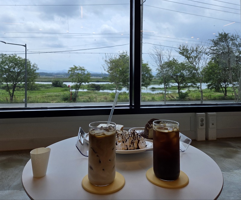 카페 내부는 예상과 달리 넓고 깔끔했으며 정갈하면서도 편안하게 꾸며진 넓은 공간이 한눈에 들어왔다. 주인분은 아름다운 미소로 우리를 반겨주었다. 그 따뜻한 환대는 단번에 우리 기분을 좋게 만들었다. 내부는 전체적으로 넓게 오픈되어 있었고 한쪽 벽면을 가득 채운 큰 통창을 통해 들어오는 자연광과 외부 풍경이 시야를 시원하게 트여 주었다. 통창 너머로는 고즈넉한 자연 풍경이 펼쳐져 있어 마음까지 평온해졌다.