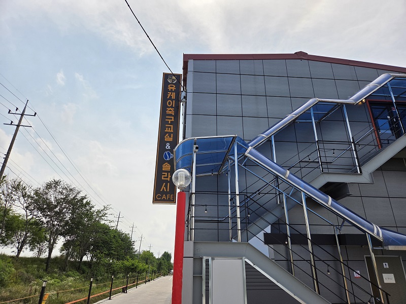 카페에 도착하니 첫인상은 다소 낯설었다. 넓은 주차장을 끼고 조립식 건물처럼 보이는 2층짜리 구조물이 눈에 들어왔고, 1층에는 유케이 축구교실 그 옆으로는 작지만 정돈된 축구장이 자리하고 있었고, 카페는 외부로 이어지는 계단을 통해 2층으로 올라가야만 하는 구조였다. 일행 중 몇몇이 다리가 불편해 높은 계단이 걱정스러웠지만 우리는 천천히 계단을 오르기로 했다.