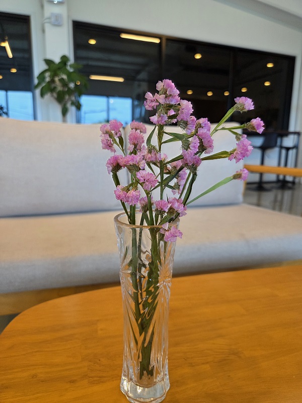 카페 구석구석에는 "스타티스" 꽃이 다양한 색감으로 정갈하게 꽂혀 있었고, 그 모습이 공간 전체에 단아하고 정돈된 분위기를 더해주었다. 꽃들이 주는 고요한 아름다움이 실내를 한층 더 편안하게 만들어주었고 감성을 자극하는 인테리어 요소로 작용했다. 벽에는 사진과 그림들이 적절하게 배치되어 있었고 전혀 산만하지 않으면서도 카페의 분위기와 자연스럽게 어우러져 있었다. 특히 오드리 햇번의 사진과 우아한 여인의 그림이 놓인 테이블은 마치 하나의 소박한 전시처럼 느껴져 눈길을 끌었다.