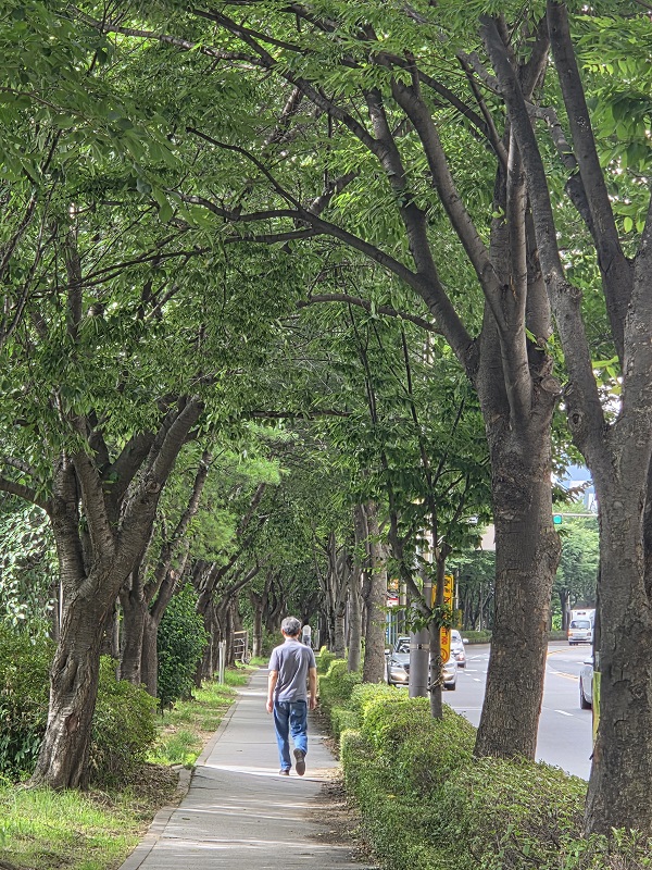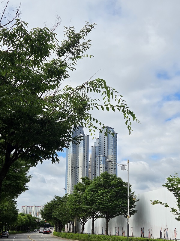 뜨거운 날씨로 돌아가는 길은 시원한 길로 걷기 위해서 산책로가 아닌 도로 옆 가로수 길로 걸었다. 벗나무들의 초록 잎사귀들이 햇살을 가려줘서, 시원하여 산책하기 좋았다. 그리고 위에서 내려다 본 천변 풍경과 저 멀리 보이는 고층 아파트, 구름, 도로, 나무, 물모든 자연과 인간이 만들어낸 작품들이 어우러져 또 다른 멋진 풍경을 만들어냈다.