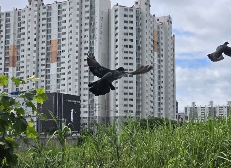 다시 걷다 보니 다리 아래에 어르신 한 분과 비둘기 들이 모여 있는 모습이 보였다. 가까이에서 그 모습을 찍어 보려고, 다리아래 쪽으로 내려가 가까이 갔는데도, 날아가지 않는 비둘기를 보고 일부러 발을 세게 내딛어 놀라게 만들었다. 그제서야 놀란 비둘기들이 하늘을 향해 날아갔다. 여러 번 셔터를 눌러 겨우 나는 모습을 찍을 수 있었다. 멋있었다. 부럽기도 했다.