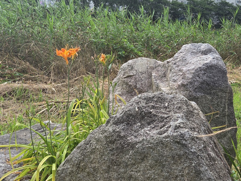 갈 때 보이지 않던 모습들이 돌아가는 길에는 새롭게 눈에 들어왔다. 돌 틈에 핀 들꽃, 그리고 편안히 둘이 앉아서 쉬기 좋은 넓은 돌, 그 옆에 핀 들꽃들, 사진을 찍다 보니 어느새 집으로 올라가는 길에 다다랐다. 이곳에는 해충 기피제를 분사할 수 있는 장치가 있어서 해충들이 많은 계절에는 기피제를 사용하고 산책하면 좋을 것 같았다. 이런 세심한 배려가 정말 고맙게 느껴졌다.