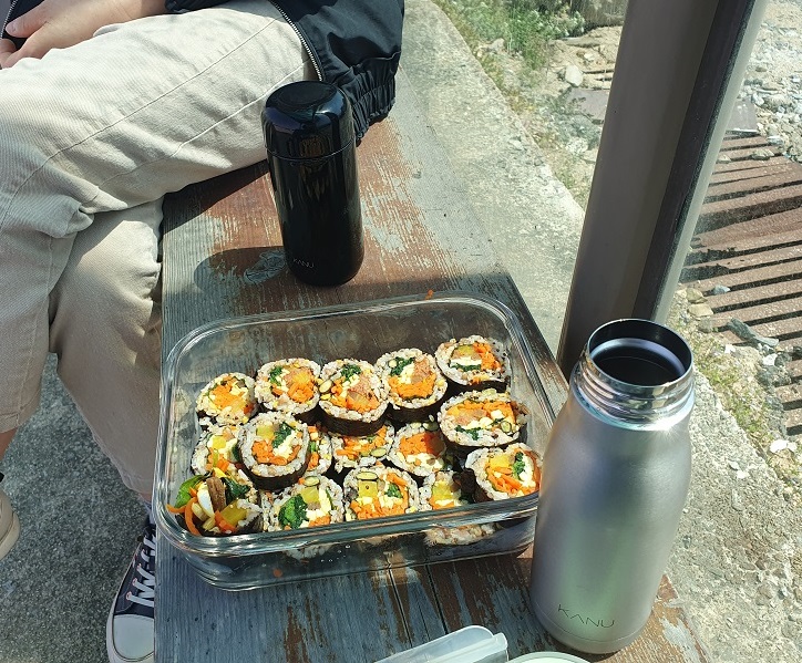 터널 끝까지 걸은 뒤, 준비 해온 도시락을 먹기 위해 벤치에 잠시 앉았는데 인파가 많아 부담스럽더라고요. 그래서 가까운 버스정류장으로 자리를 옮겨 따뜻한 매실차와 함께 도시락을 즐겼습니다.