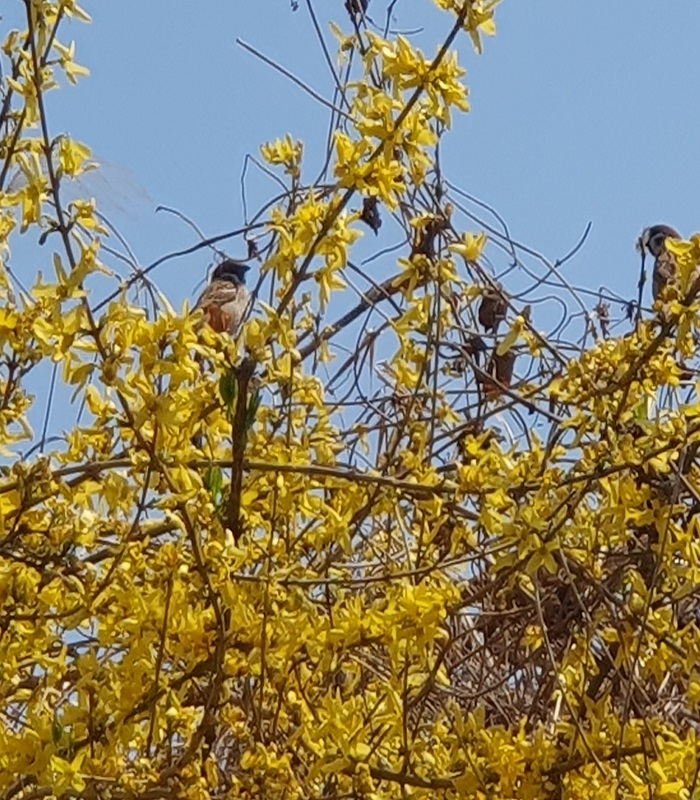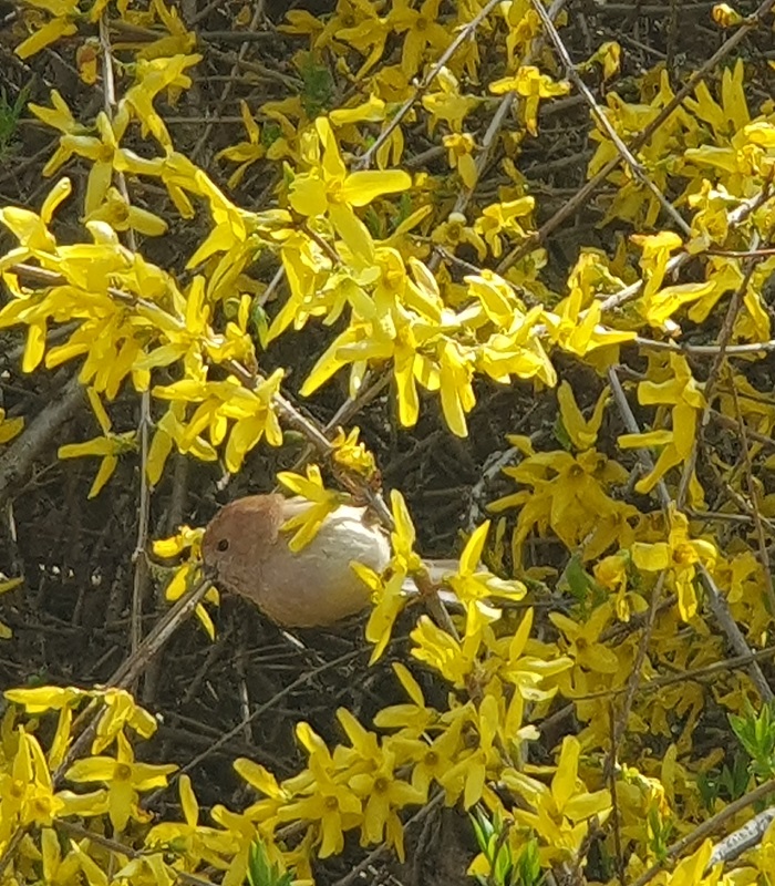 개나리를 둥지삼아 지저귀며 노니는 새들(숨은새 찾기)